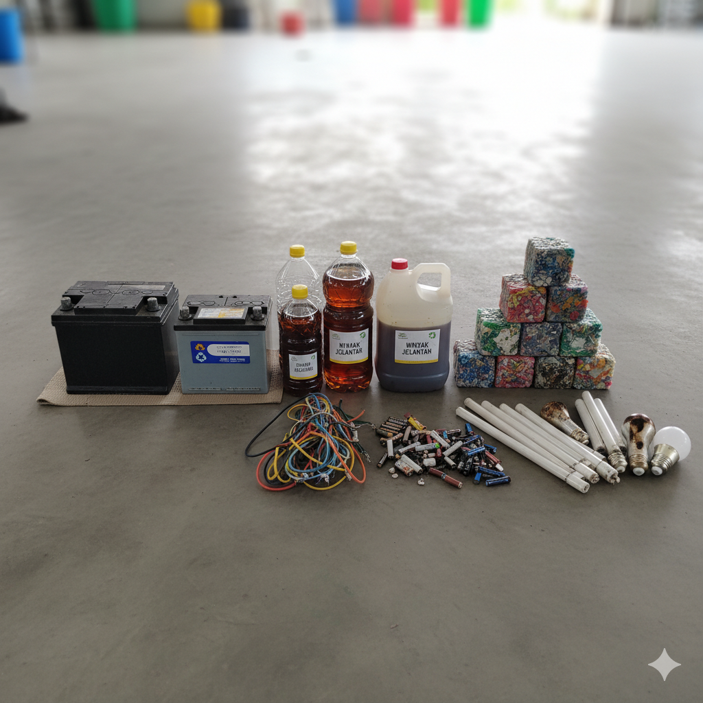 - Aki Motor/Mobil: Di sisi kiri, terdapat dua buah aki (accu) bekas, satu berukuran lebih besar (kemungkinan aki mobil) dan satu lebih kecil (aki motor). Sampah ini termasuk limbah B3 (Bahan Berbahaya dan Beracun) karena mengandung cairan kimia berbahaya.